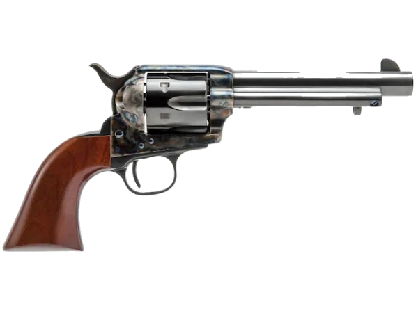 The 1873 peacemaker-style revolver, originally designed for the U.S. Cavalry, quickly became the archetypical sixgun of the frontier. Available in a number of powerful chamberings in different barrel lengths, besides the “peacemaker,” it was also known by other monikers like “hogleg,” smoke wagon,” and “equalizer.” In civilian hands, it quickly earned a reputation as a rugged, hard-hitting, well-balanced revolver and outsold all competitors. Men like Wyatt Earp, Bat Masterson, John Selman, the James-Younger gang, the Daltons, Texas, and later the Arizona Rangers, all packed this legendary arm and did their smoky work with it. With the coming of the Silver Screen, the Model P was reintroduced to an entirely new generation of admirers. In the hands of such Western stars as John Wayne, Roy Rogers, Hopalong Cassidy, Tom Selleck, Clint Eastwood, and countless others, this sixgun has earned lasting fame with shooters and Old West fans alike! Considered as the most authentic and highest quality reproduction of the 1873 Colt, Cimarron’s replica was reproduced in every detail from an original 1873 single action in the Cimarron antique collection and was not replicated by working simply from drawings, as with previous reproductions. Cimarron also took extra steps to improve the gun’s reliability with the Cowboy Compaction which eliminates weaknesses associated with the 19th-century design. Offered in the 7 1/2, 5 1/2, or 4 3/4-inch barrel lengths, in either the pre-1896-style Old Model with the cylinder base pin screw located in the front of the frame or the post-1896 Pre-War frame, where the cylinder base pin retaining screw is found on the side of the frame, in front of the cylinder. It comes in .32-20, .38-40, .38 Special/.357 Magnum, .44 Special, .44-40 or .45 Colt. Cimarron’s Model P is the sixgun of the West!
